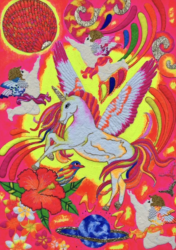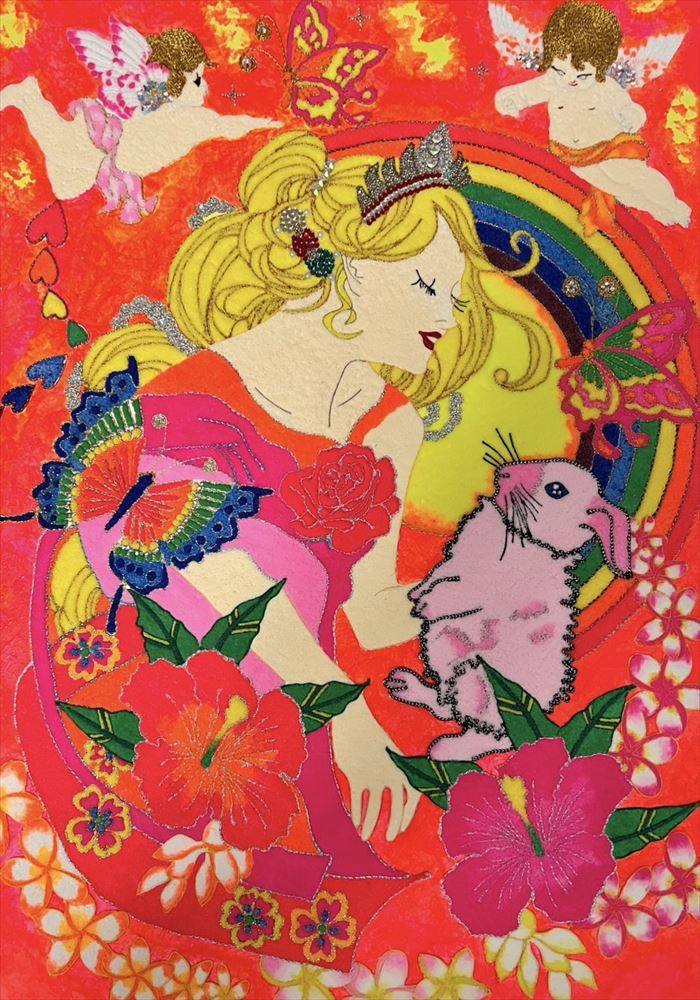 また絵に細かいラインストーンを施し塩絵の具の鮮やかな光と相まってキラキラした作品も多く描いています。